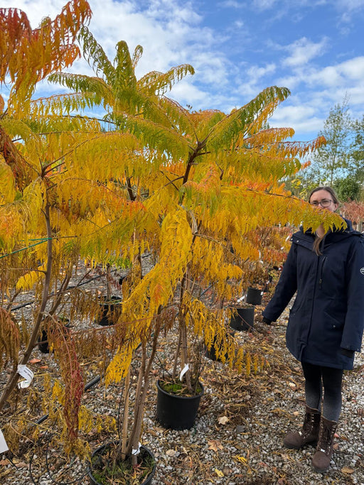 View full detailsRhus typhina ‘Dissecta’ – Lace-Like Foliage and Autumn Fire Rhus typhina ‘Dissecta’, commonly known as the Cutleaf Stag’s Horn Sumach, is a bold ye...