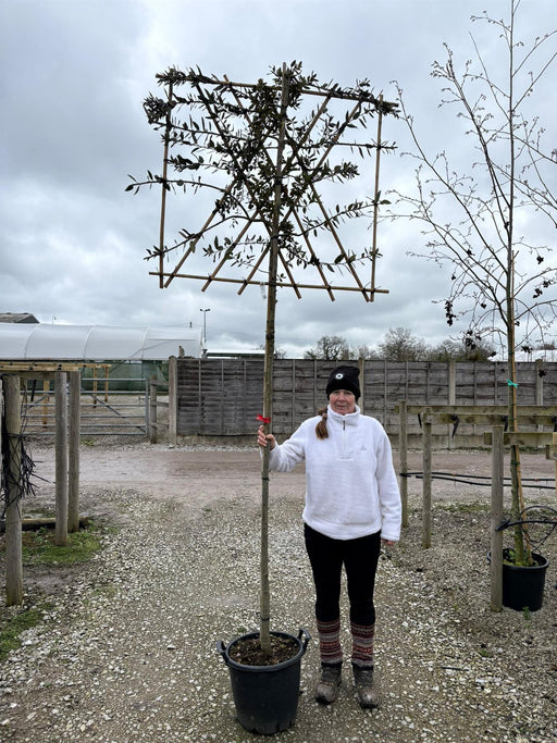 Pleached trees are supplied at a fixed stem height, with the trained framework typically starting between 1.8 and 2.2 metres, depending on the species and size selected.