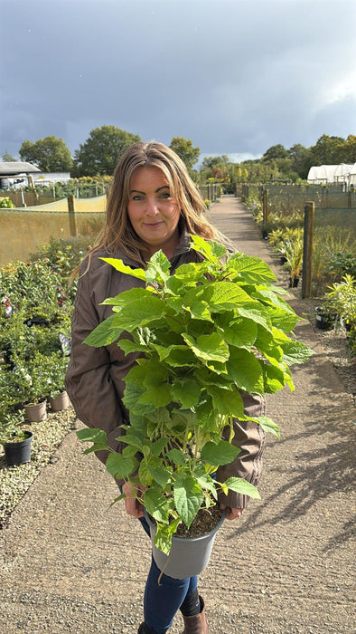 Hydrangea arborescens 'Annabelle', commonly known as the Annabelle Hydrangea, is a beloved deciduous shrub renowned for its large, globe-like clusters of white flowers, its robust growth, and its adaptability to a variety of garden styles. With its striking blooms in summer, followed by attractive foliage in autumn and winter, 'Annabelle' brings beauty, elegance, and seasonal interest to gardens, borders, and landscapes.