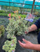Pieris Little Heath, a slow growing shrub with creamy variegated leaves which are tipped red on new growth.